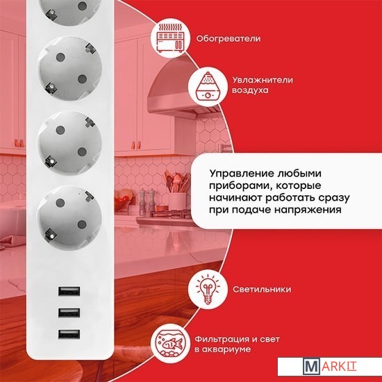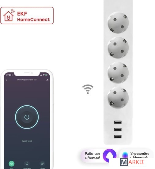 Умный удлинитель EKF Connect поможет сделать обычные приборы умными. При помощи приложения для Android и iOS, а также при помощи голосовых помощников Алиса от Яндекса и Маруся от Mail.ru Group и Салют от Сбера можно управлять светильниками, вентиляторами, обогревателями, увлажнителями и любыми другими приборами, которые начинают работать сразу же при подаче напряжения. Кроме 4 розеток есть ещё 3 порта USB для зарядки мобильных устройств. Версия Pro поддерживает индивидуальное управление каждой розеткой, а также позволяет измерять напряжение, силу тока, мощность, и собирать статистику энергопотребления по дням и месяцам.